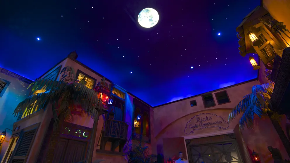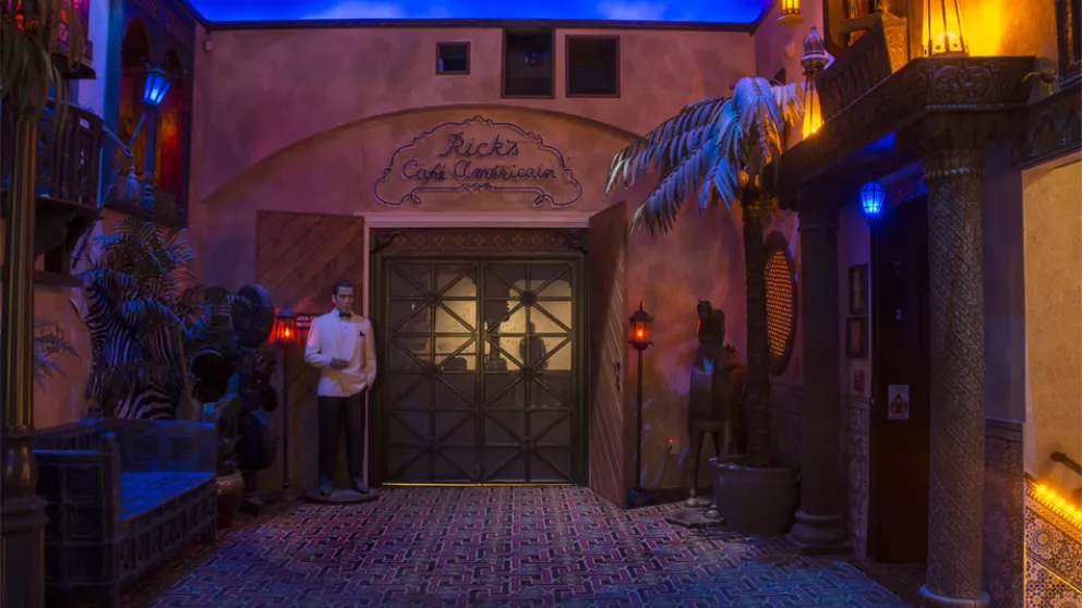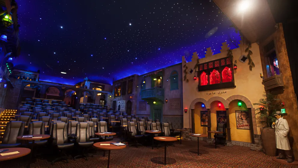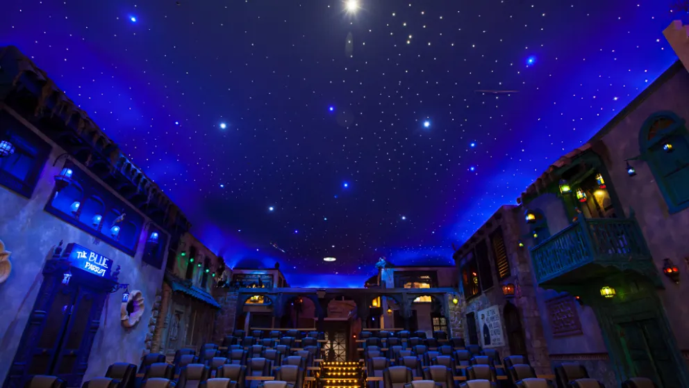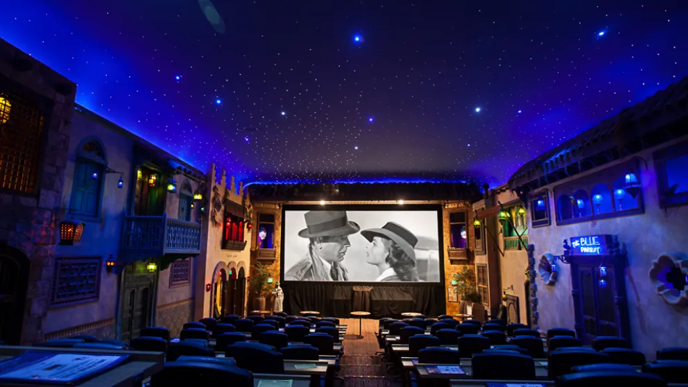 We ran out of land so we put this, our most detailed auditorium ever, up on the roof. Straight from the Kasbah and right out of the desert you’ll find yourself sitting under a starry desert night sky (actually thousands of fiber optic twinkle lights) in our own little Casablancan oasis. Built with meticulous attention to detail, you will be surrounded by a dozen Arab buildings, each facade being a different color and stucco style, fitted out with thirteen types of decorative Moroccan ceramic tiles, three colors of barrel roof tiles, dozens of dozens of authentic pieces of Arab woodwork including doors, windows, shutters, columns, arches, balconies and railings, Islamic carpets, drapes, tapestries and even Bedouin tent sides and zebra hides. The over 100 authentic decorative Moroccan light fixtures range from small handmade lanterns to large chandeliers all made with stain and cut glass, beads, fringe, copper, tin and brass. Of special note is the pair of ornate wood columns by the elevator with intricately hand carved feathers spiraling up from base to crown. Nearby is a large metal urn with very delicate cut copper Arab calligraphy inlaid into the hand-forged brass. On the South wall is a pair of very intricate windows that were hand-chiseled by Berber tribesman from red sandstone quarried in the famous Riff Valley. The entry plaza is separated from the seating area by a series of five arches spanning over 40 feet and carved from native timber over 100 years ago. (Note the flock of vultures perched on one end, they are obviously scavengers and hungry by nature so keep a close eye on your popcorn.) The oldest pieces are the 200-year-old door, deeply carved with Arabic calligraphy with the letters highlighted in blue and the antique flintlock camel rifles from the 18th century that hang in the stairs connecting this grand auditorium to the street below. Humphrey Bogart is in the corner keeping watch over your movie experience. Bogie came to this auditorium “for the waters” and his real life son Stephen came to inaugurate this auditorium for the movie “Casablanca”.
