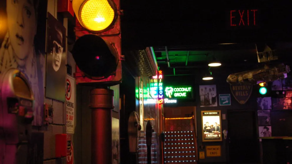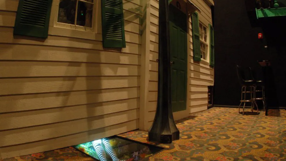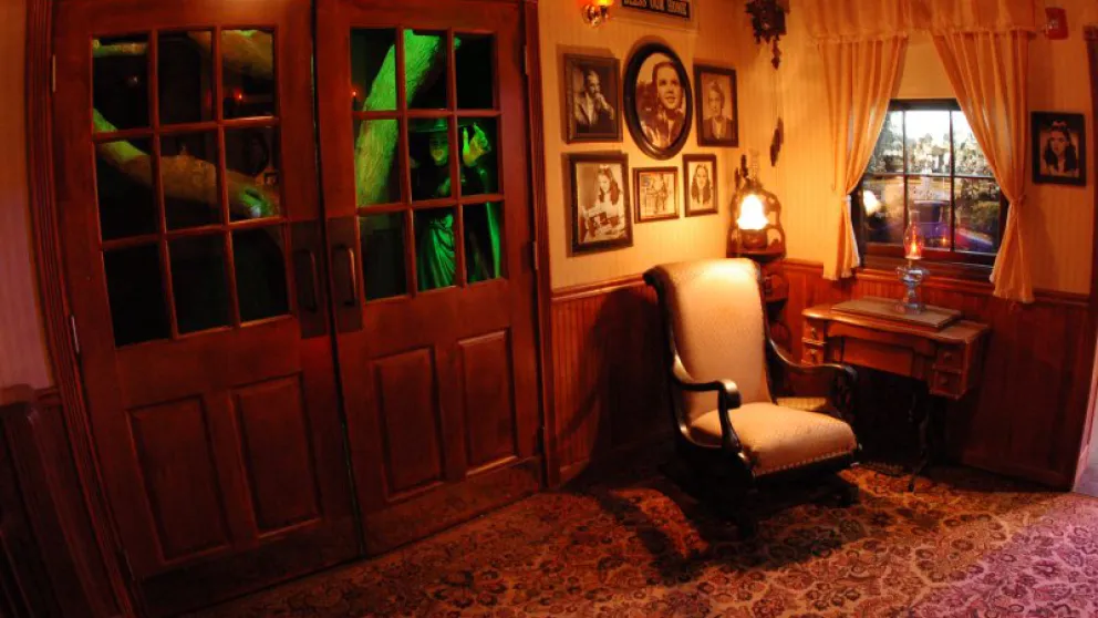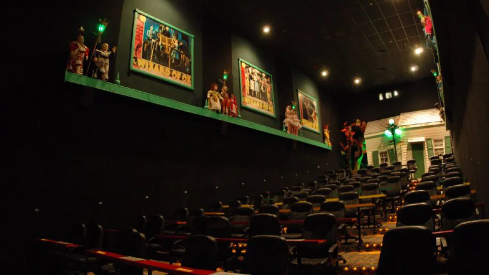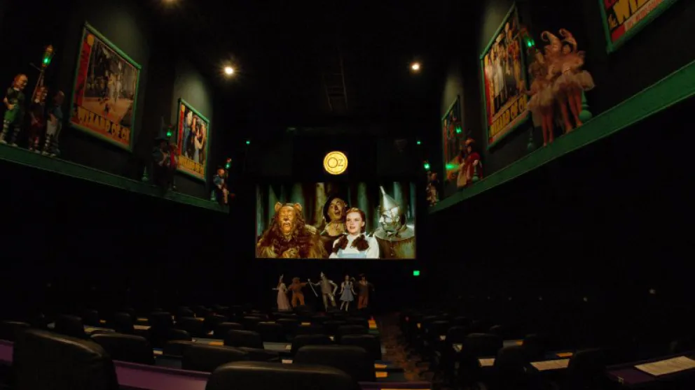 The “Rainbow Room”. This auditorium is named in part for the famous Hollywood restaurant on the Sunset Strip but pays tribute to L. Frank Baum’s classic story “The Wizard of Oz”. The restaurant has served up many a meal and lots of good times to those in the film industry. Marilyn Monroe & Joe DiMaggio met on their first blind date there, and it is where John Belushi ate his last meal. Warren Zevon sings about it in his song ’Poor Poor Pitiful Me’ and there is track on a Cheech & Chong album named after it. Notable regulars have included Elvis, John Lennon, Elton John, Alice Cooper, Neil Diamond, Janis Joplin, Led Zeppelin and more. Enter ‘under the Rainbow’ and through Dorothy’s House, take a right turn in the living room and a left at the Haunted Forest (watch out for the witch and flying monkeys) and you’ll arrive in our emerald green Auditorium!!! Keep an eye on the sky for falling houses or rising hot air balloons! Don’t step on the “Wicked Witch of the East”, her sister lurks nearby. There are also 17 full sized (so to speak) Munchkins adorning the side walls which were originally made as display pieces for the windows of Macy’s Department Store in New York as part of their 60th Anniversary celebration of the making of the classic MGM film. Notice also the emerald green stain glass, the primary characters down in front of the screen and even a talking apple tree. Hollywood Blvd Cinema is responsible for the Munchkins being recognized with a Star on the Hollywood Walk of Fame on the sidewalk of that other Hollywood Blvd in Los Angeles, right in front of Grauman’s Chinese Theater.