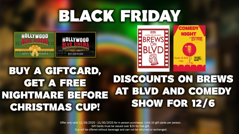 Our Black Friday deals are perfect for the movie lover in your life! Get a gift card in person and receive a free Nightmare Before Christmas thermal cup. Or, get $10 off admission to either Brews on Blvd or the Comedy Show taking place on 12/6.