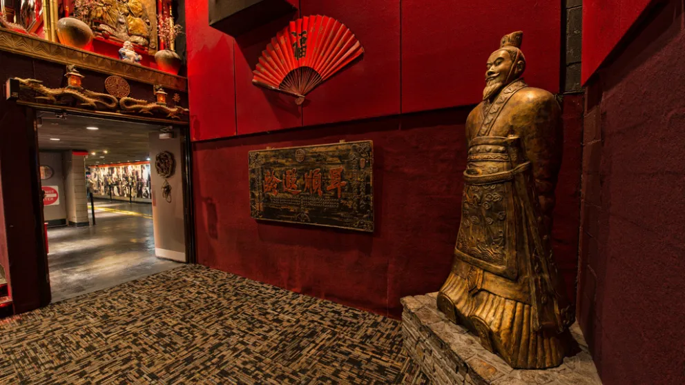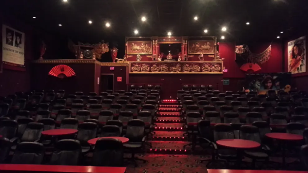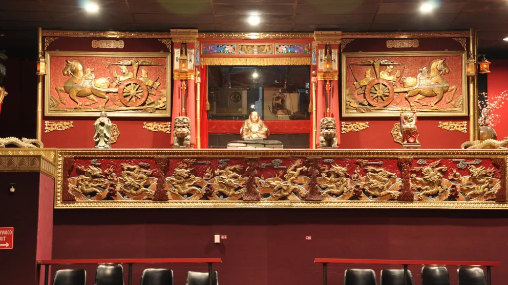 This is the largest of our ten auditoriums. There is a large hundred year old carved wall panel as you enter next to a terra cotta statute of a General reproduced from those found in the Qin Dynasty architectural digs in Xian Province. This room features some great stuff ranging from 26-foot-tall palm trees to full size Chinese New Year’s parade dragons. The 8 foot tall gold & bronze Temple Dogs under the screen were imported from Beijing. The large medallions hanging in front of the stage curtains were restored here, but were found dirty and dilapidated in a rear storeroom of a local Chinese antique store and are thought to be about 200 years old. The 24-foot-long framed “Nine Manchurian Dragons” on the back wall was carved in Taiwan and hand painted here. Above the panel is our own Chinese Palace with a century old Chinese gong, antique sculpted wall panels, a pair of giant palace jars wrapped in gold dragons, lots of authentic Chinese lanterns, bells, temple dogs, murals and a 150 year old carved wood arch over a gold Buddha centerpiece to round out our oriental fantasy.