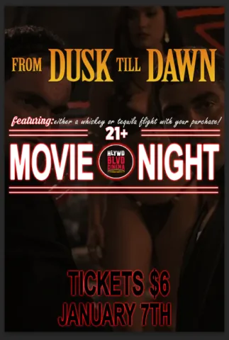 21+ Only Event- Ticket options include companion for $6, Whiskey Flight + $5 movie ticket for $20 & a Tequila Flight + $5 movie ticket for $20. All guests will be carded at the door.